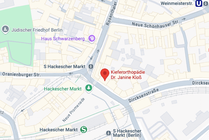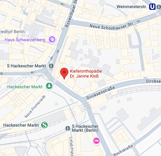 Unsere Praxis liegt zentral am Hackeschen Markt und ist optimal mit öffentlichen Verkehrsmitteln zu erreichen: S-Bahn: S3, S5, S7, S9 (Haltestelle Hackescher Markt) Tram: M1, M4, M5, M6 (Haltestelle Hackescher Markt) Bus: TXL, 200 (Haltestelle Spandauer Str./Marienkirche)